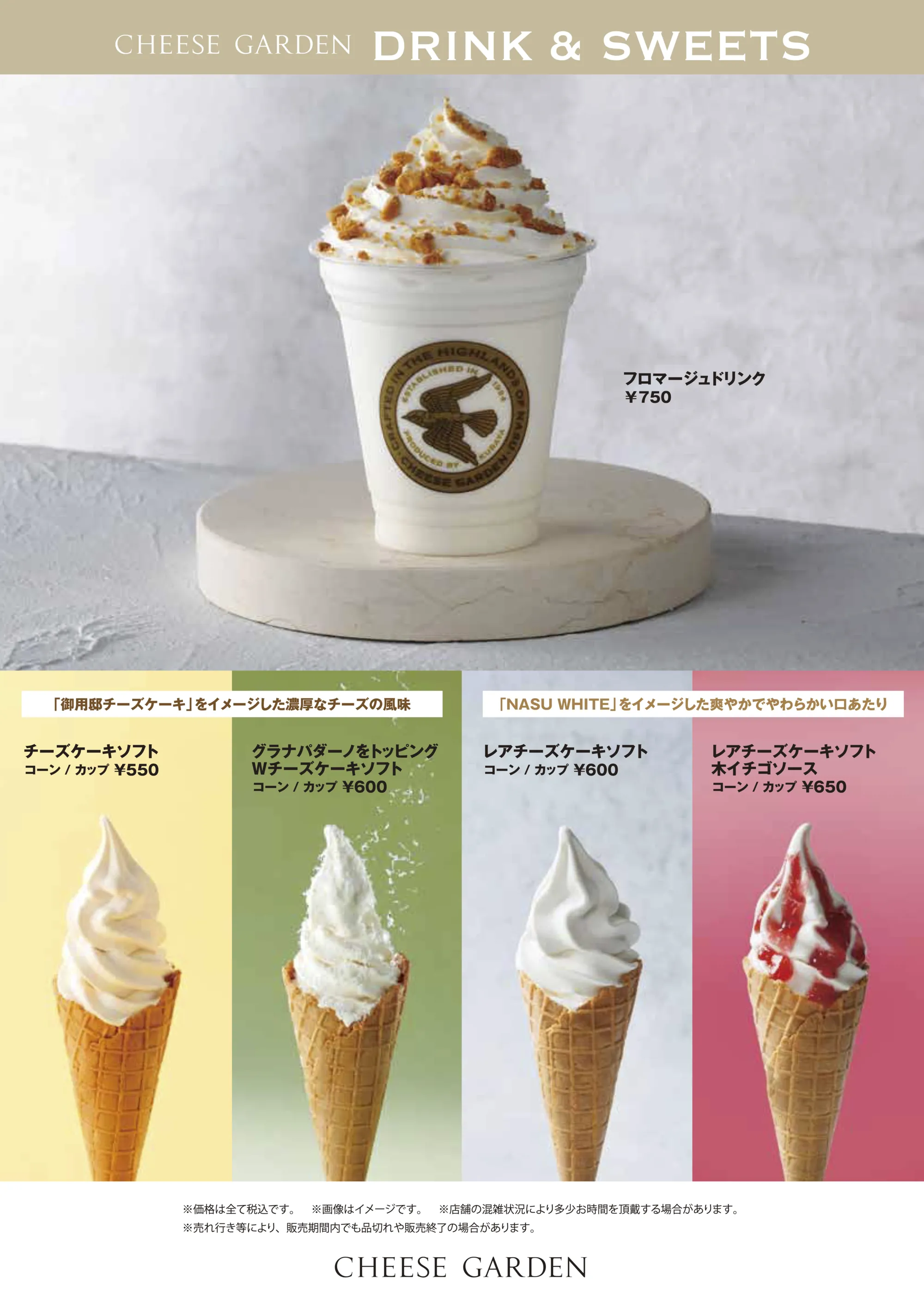 フロマージュドリンクとソフトクリーム4種の販売がございます。