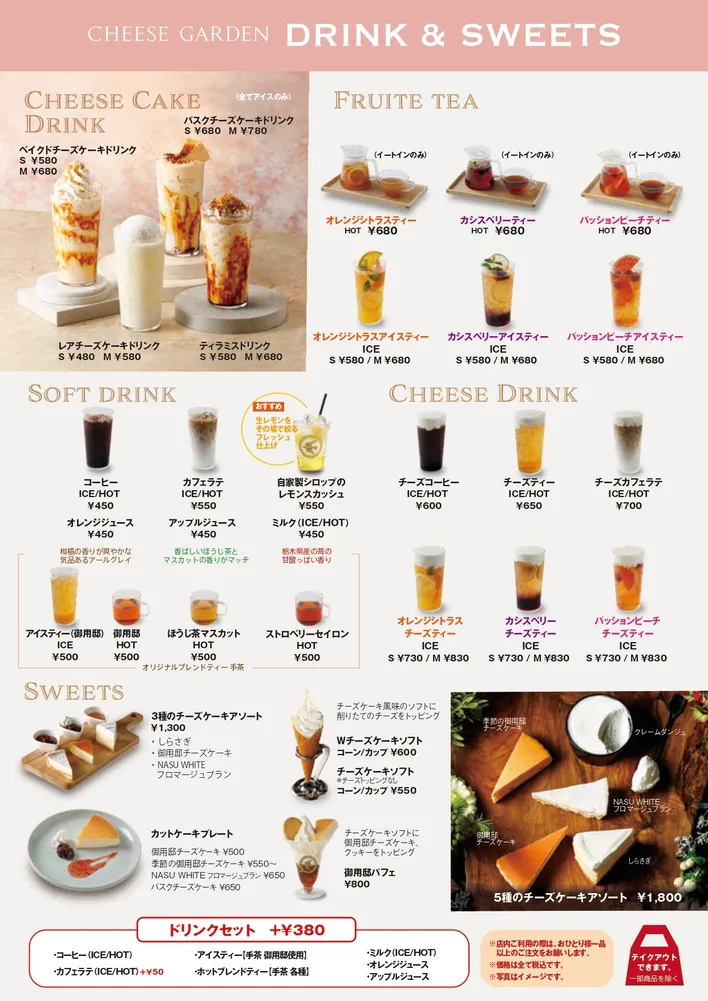 2 種類のチーズケーキベースドリンクで味わうチーズスイーツドリンクや、『御用邸チーズケーキ』をはじめとした5種類のチーズケーキが楽しめるチーズケーキアソート、季節ごとに変わるパフェなどのスイーツをご用意。