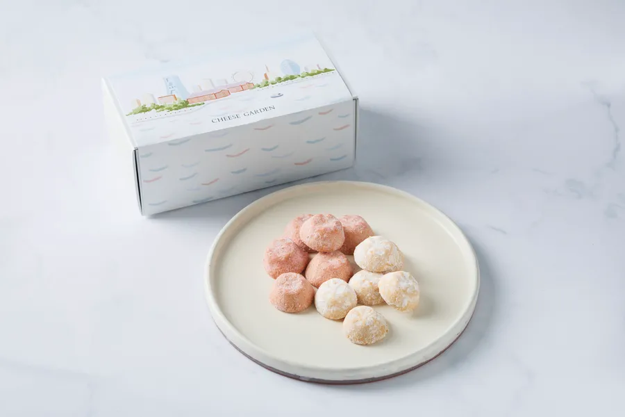 口に入れるとほろっと崩れる食感と、優しく上品な味わいが楽しめます。チーズとストロベリー2種類のフレーバーをセットにしました。
