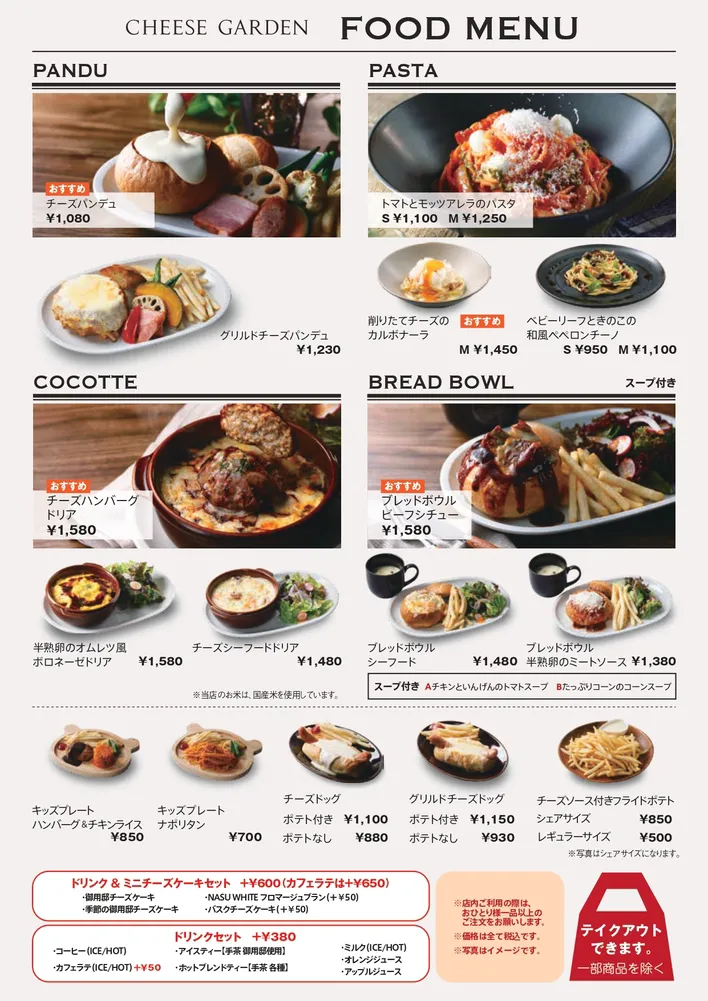また、チーズがたっぷりとパンの器に入った『チーズパンデュ』や、たっぷりチーズソースの『チーズドック』などチーズにこだわったフードもお楽しみいただけます。