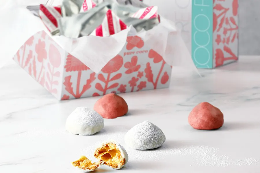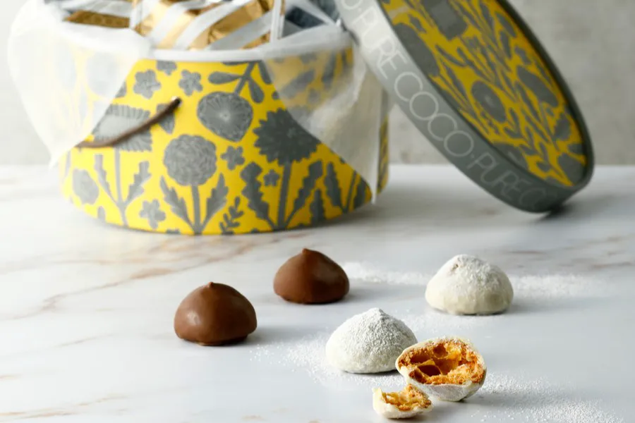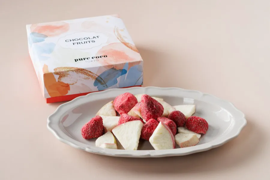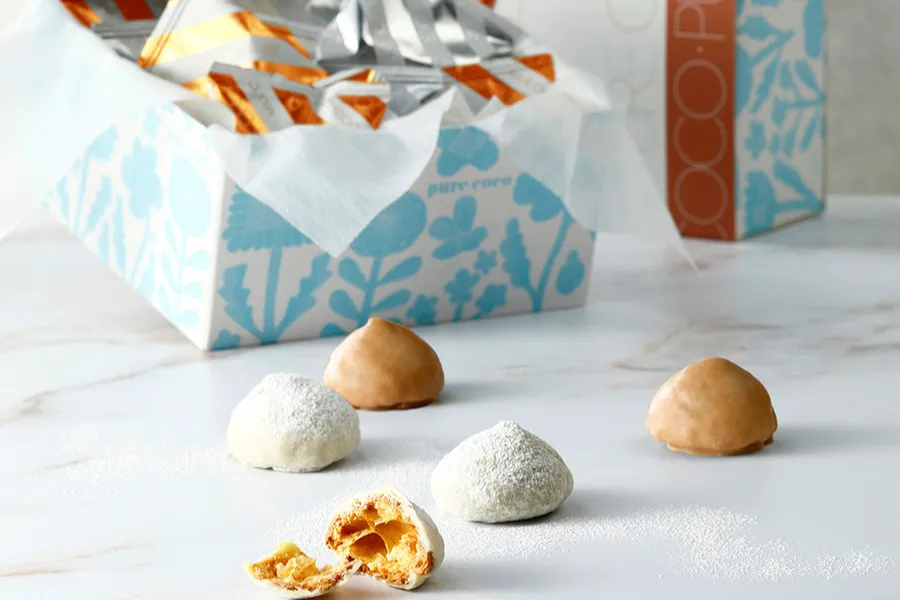 じっくり時間をかけて焼き上げたチーズ風味のサクサクのシュー生地に、チョコレートなどをまとわせた『ピュアココ シュー』をはじめ、シャンパンやワインともあう『ピュアココ オリーブ』、2種類のフリーズドライフルーツにホワイトチョコレートを染み込ませた『ショコラフルーツ』、ハイブリッドスイーツ『ブルッキー』を販売しています。