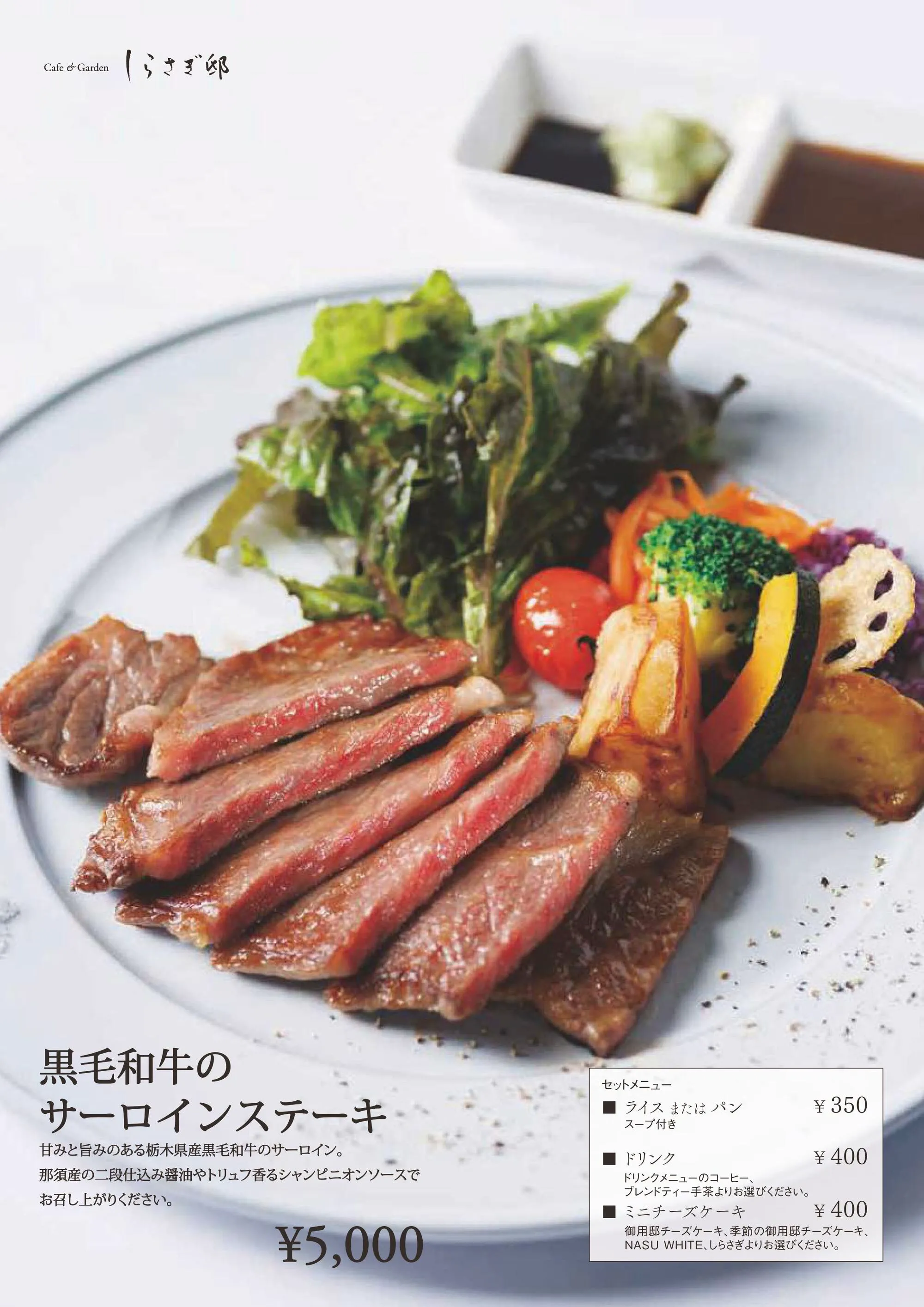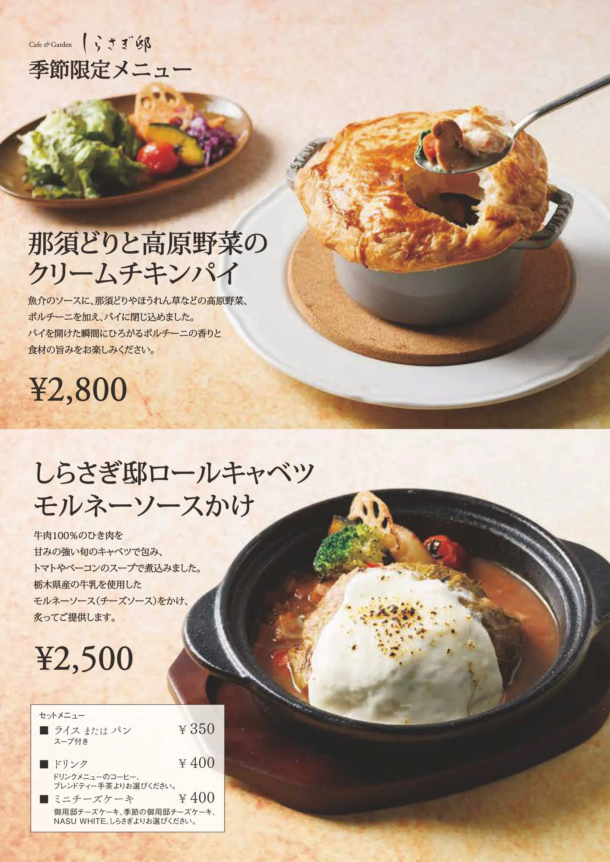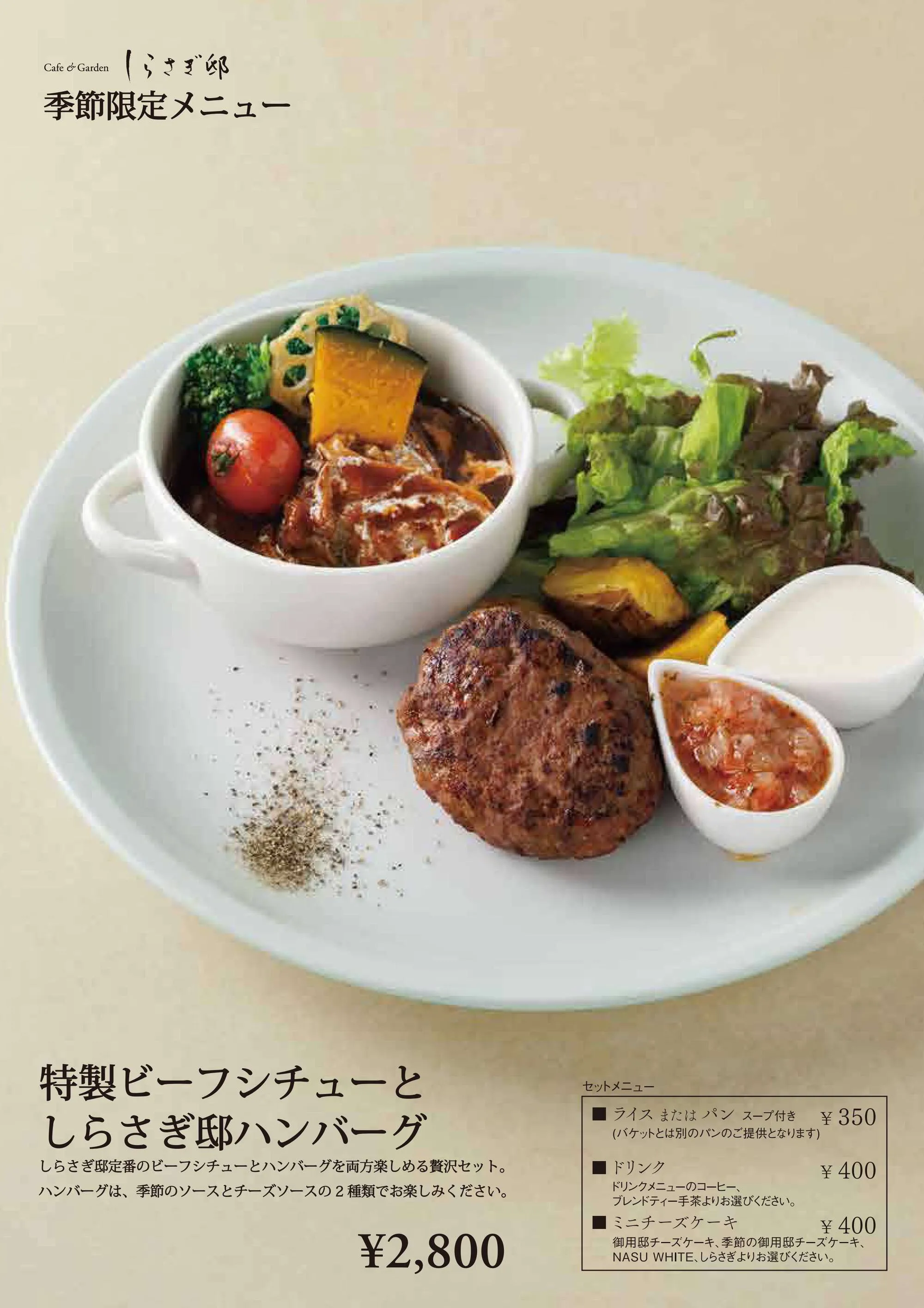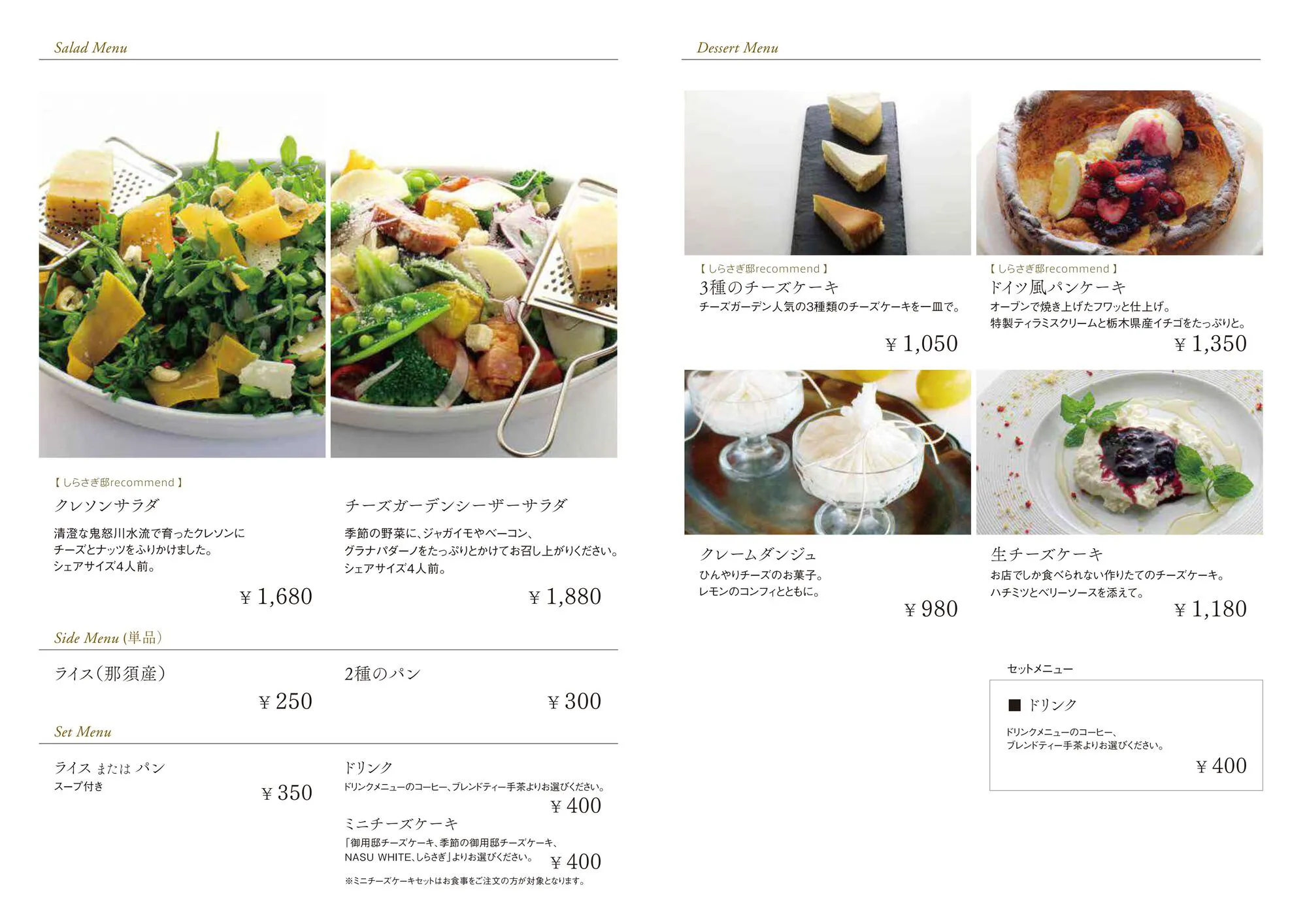 他にもしらさぎ邸でしか食べられない『生チーズケーキ』や、『3種のチーズケーキ』などのスイーツも充実。お食事はもちろん、カフェとしても気軽にご利用ください。