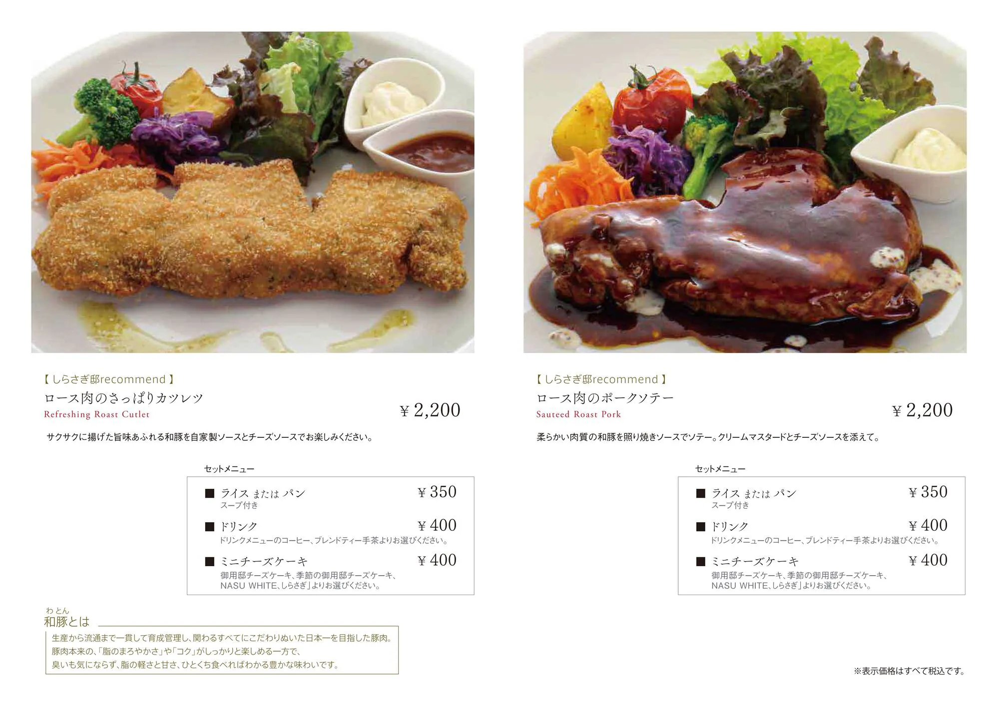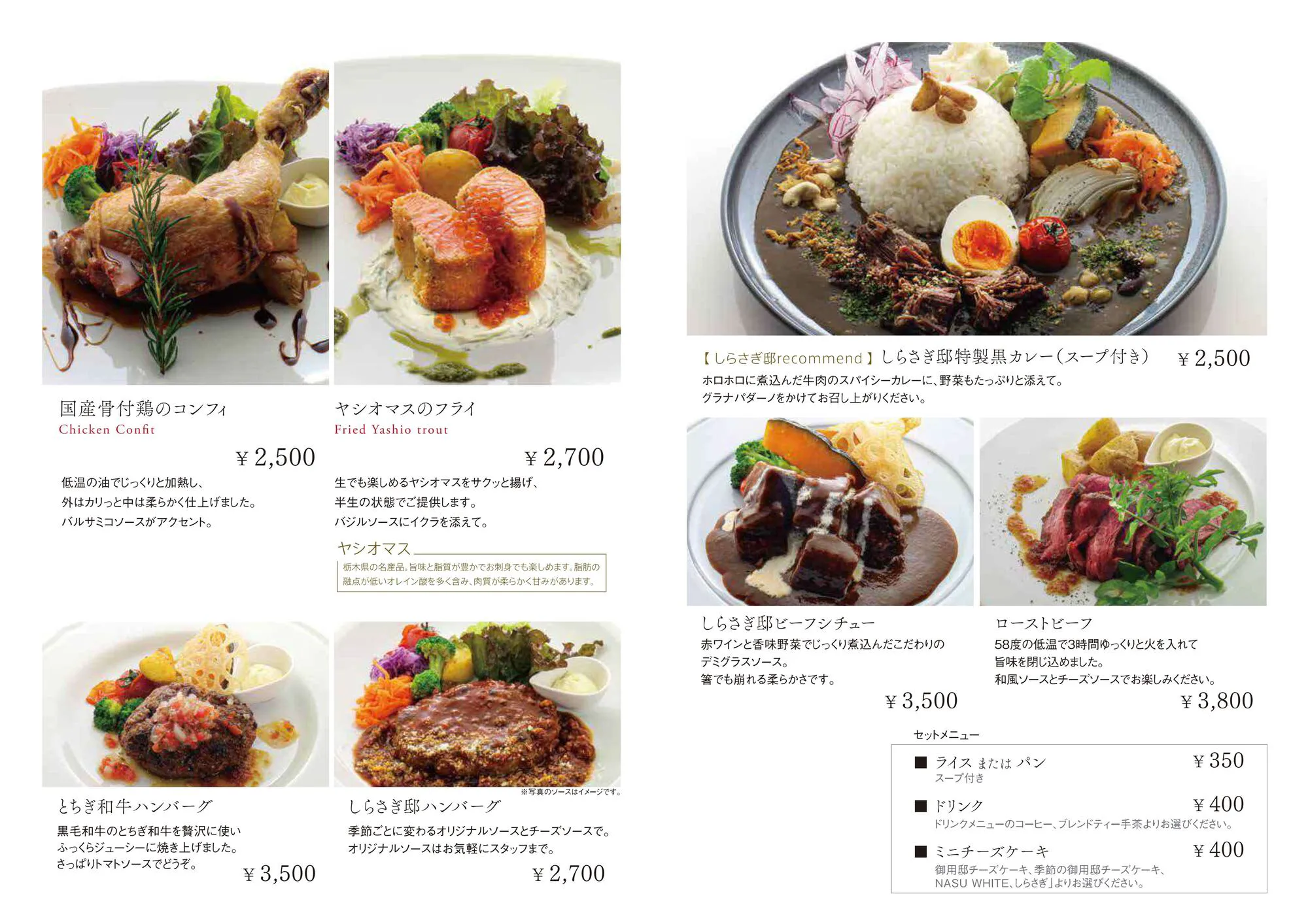 一番人気の『ロース肉のさっぱりカツレツ』は、和豚を使用しているため、ボリューム満点でありながら女性でも美味しくお召し上がりいただけます。また、しらさぎ邸の看板メニューである『しらさぎ邸特製黒カレー』はピリッとした辛さのなかにホロホロに煮込んだ牛肉の美味しさがぎゅっと詰まったうまみを感じる手間暇をかけた逸品です。